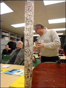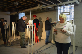 C. Mehrl Bennett's report: Keith Buchholz installed lots of old radios on pedestals and distributed John Cage's written words for Cage's score "INDETERMINACY" ‐ which also involves people randomly adjusting the channels/volumes on the radio as people took turns reading Cage's words. Video by Jonathan Leiter.