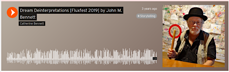 At Fluxfest Toronto (2019) in an art gallery setting, fluxfest participants were asked to write about a nocturnal dream they had, using only one to four words. The idea was for poet, John M. Bennett, to de-interpret each dream at a later performance. This is the audio for that score. C. Mehrl Bennett reads each dream phrase during this recording (John did not read them before hand). [Audio by C. Mehrl Bennett.]